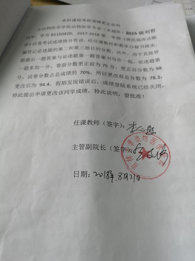 2015年级动物医学专业刘哲同学(学号:86150318)2017-2018-2学期兽医临床诊断学课程成绩更正如下: