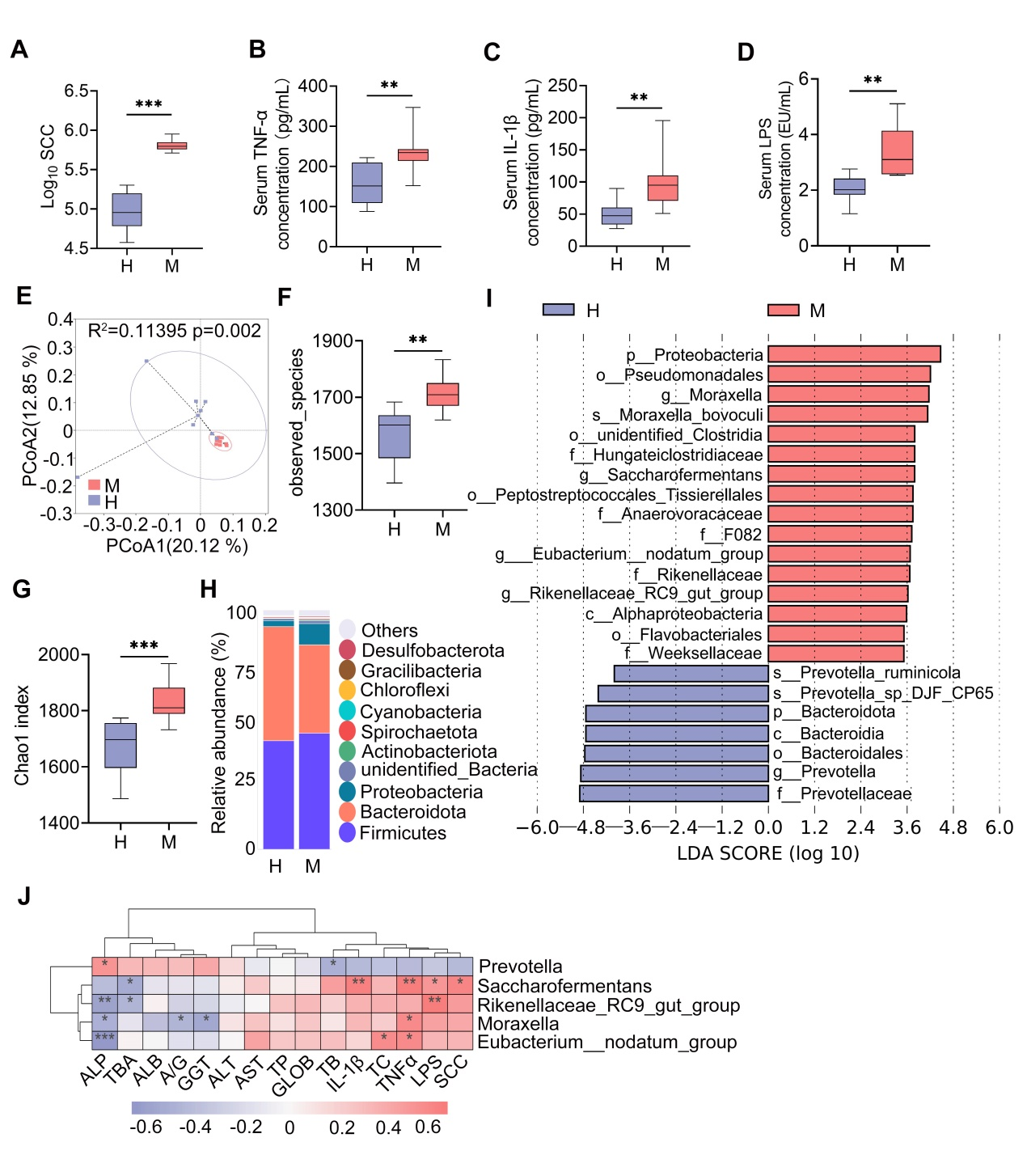 张乃生/付云贺课题组基于团队的前期研究结果,推测乳腺炎的发生除了与传统认为的外界病原感染有关外,尚存在内源性致病途径,并提出“肠源性乳腺炎”这一病理学概念。本研究通过奶牛乳腺炎病例,聚焦奶牛瘤胃微生物,发现瘤胃菌群紊乱可通过引起低度内毒素血症,损害机体抗炎酶活性,从而诱发系统性炎症和乳腺炎。相关研究成果于12月1日在线发表于国际学术期刊《Microbiome》《Gut dysbiosis induces the development of mastitis through a reduction in host anti-inflammatory enzyme activity by endotoxemia》。本研究再次佐证课题组之前提出的“肠源性乳腺炎”这一病理学假设,并表明肠道菌群紊乱诱导的内毒素血症是诱导乳腺炎发生关键因素,这为深入认识和破解乳腺炎发病机制,以及靶向“肠-乳轴”防治乳腺炎提供了理论指导。