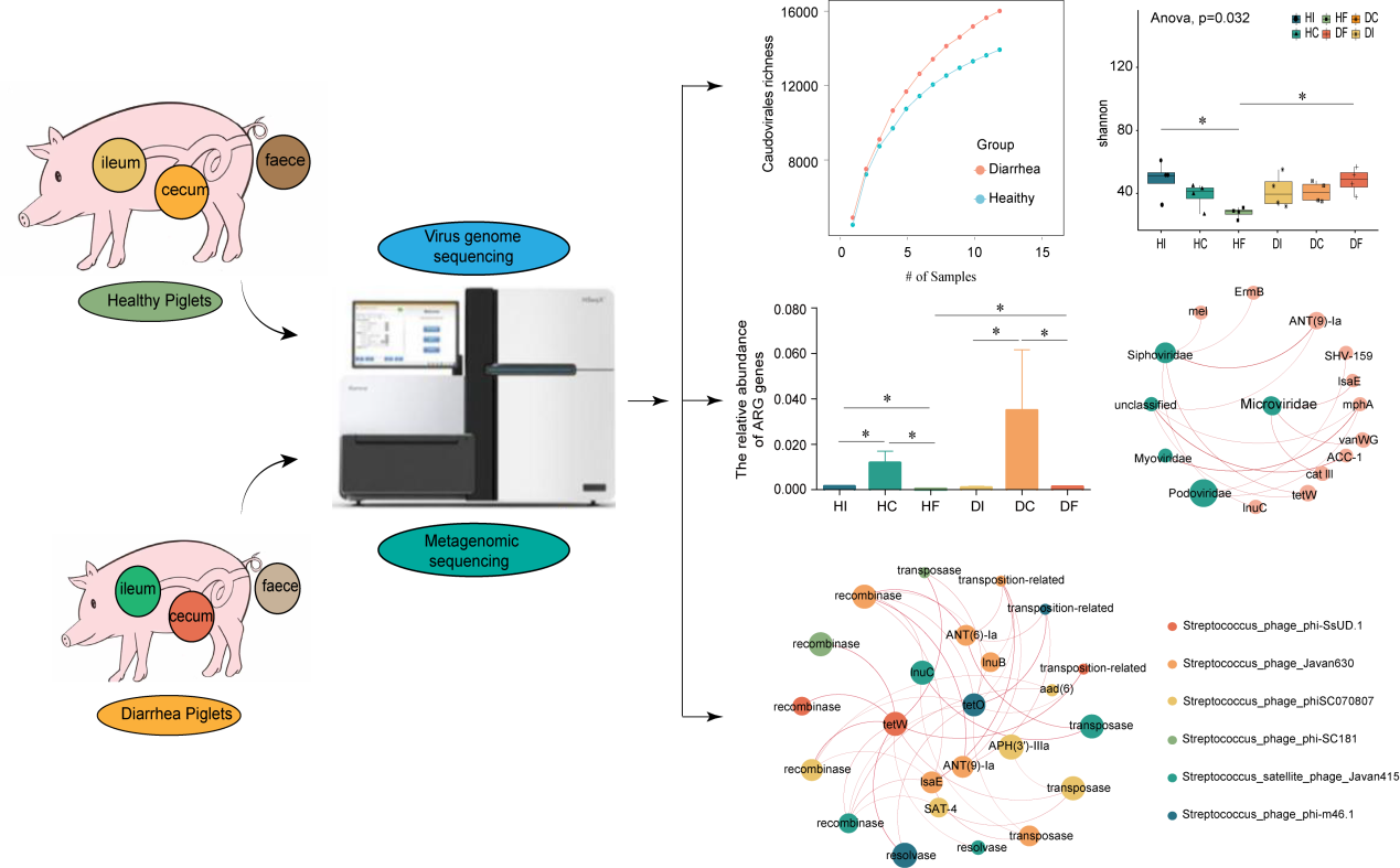 抗生素耐药病原体的日益流行导致人们更好地了解导致这种扩张的潜在过程。集约化养猪场被认为是抗生素抗性基因 (ARG) 传播的热点之一。噬菌体作为ARGs的重要移动载体,广泛存在于动物肠道中。然而,对猪肠中噬菌体相关 ARG 及其潜在驱动因素的了解有限。因此,课题组分别对健康仔猪和腹泻仔猪不同肠道(回肠、盲肠和粪便)内容物的病毒 DNA 和总 DNA 进行了宏基因组测序和分析。结果表明仔猪盲肠中的噬菌体是 ARG 和移动遗传元件 (MGE) 基因的主要储存库。噬菌体相关的 MGEs 是影响 ARGs 维持和转移的重要因素。有趣的是,ARG 和 MGE 基因在仔猪肠道噬菌体中的共定位似乎不是随机选择的,而是与特定的噬菌体宿主(链球菌)有关。此外,在腹泻仔猪的粪便中,携带ARGs和MGE基因的噬菌体丰度显着增加,同时多价噬菌体(具有广泛宿主范围的噬菌体)的多样性也显着增加,这将促进ARGs在肠道细菌群落中的转染和更广泛分布。重要的是,预测的腹泻粪便中多价噬菌体的宿主谱趋向于潜在的肠道病原菌属,这大大增加了肠病菌获得 ARGs 的风险。该研究极大地扩展了对仔猪肠道微生物组的认识,揭示了仔猪肠道ARGs维持和传播的潜在机制,为畜牧业ARG污染防控提供了参考。