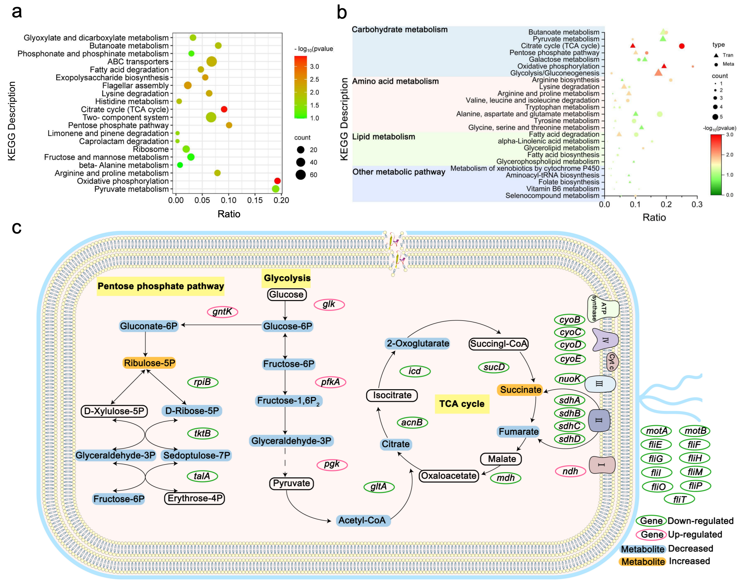 通过一系列的膜机制实验和多组学的分析揭示,抗菌肽SR25具有两个独特的靶标,即破坏细菌膜的完整性和抑制琥珀酸泛醌氧化还原酶(SQR)的活性。联合分析的KEGG富集途径表明三羧酸循环和氧化磷酸化途径发生了显著变化。三羧酸循环的关键基因(acnB、sucD、sdhABCD和icd)和代谢产物(乙酰辅酶A、柠檬酸、α-酮戊二酸和富马酸)下调,表明三羧酸循环受到抑制。研究人员在代谢组学的代谢物富集中注意到琥珀酸含量显著增加,琥珀酸通过呼吸复合物Ⅱ的催化转化为富马酸。复合物Ⅱ是三羧酸循环中的关键酶,也是呼吸链中的关键参与者。相应地,与复合物Ⅱ(sdhABCD)、复合物Ⅲ(nuoK)和复合物Ⅳ(cyoB、cyoC、cyoD和cyoE)相关的基因表达在氧化磷酸化途径中显著下调,表明电子传递链受到阻断,ATP合成可能减少,这与观察到的细胞内ATP浓度下降一致。进一步的研究发现SR25完全抑制了来自大肠杆菌的复合物Ⅱ的SQR活性,通过分子动力学模拟和丙氨酸突变等实验确定了SQR中与SR25相互作用的主要氨基酸残基。