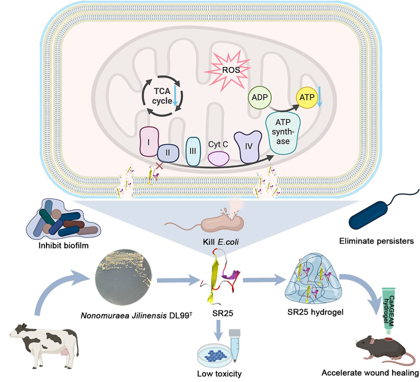 杨勇军教授团队在学术期刊《Advanced Science》上发表,题为“Dual-mechanism Peptide SR25 has Broad Antimicrobial Activity and Potential Application for Healing Bacteria-infected Diabetic Wounds”的研究论文。这项研究从奶牛肠道共生菌中发现了一株新的放线菌种,命名为吉林野野村放线菌(Nonomuraea Jilinensis DL99T),从其全基因组序列中挖掘并鉴定了一种抗菌肽SR25。该肽在高浓度下对哺乳动物细胞没有明显毒性,而在低摩尔浓度下,可以有效杀灭革兰氏阴性和革兰氏阳性致病菌,同时抑制生物被膜的形成并消除持留菌,并且没有可检测的耐药性产生。