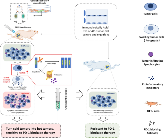 该团队的研究发现,溶瘤性副痘病毒(ORFV)可诱导肿瘤细胞及组织发生Gasdermin E(GSDME)介导的的细胞焦亡。ORFV疗法可通过抑制GSDME蛋白的泛素化降解,增强GSDME的胞内蛋白水平,进而ORFV诱导GSDME裂解活化,促进细胞焦亡发生;肿瘤细胞焦亡将CTL募集到肿瘤微环境中,同时释放炎症介质,进一步激活抗肿瘤免疫应答,重塑了免疫微环境,使“冷”肿瘤转化为“热”肿瘤,显著敏感化免疫“冷”肿瘤对免疫检查点阻断疗法的应答;利用病毒重组技术构建的毒力基因缺失重组病毒,在获得良好生物安全性的同时维持了其抗肿瘤能力(如图所示)。