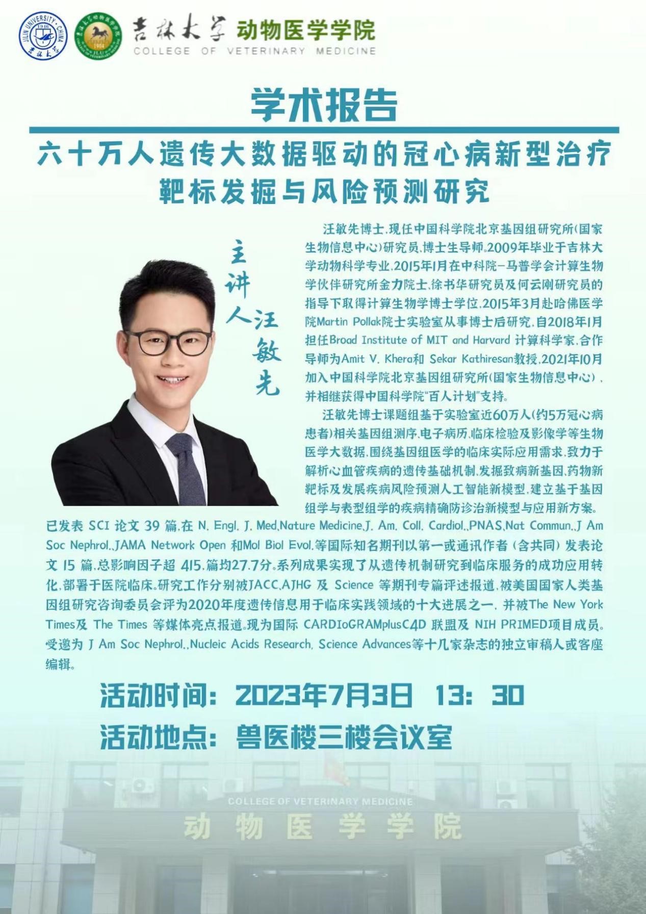 汪敏先博士课题组基于实验室近60万人(约5万冠心病患者)相关基因组测序、电子病历、临床检验及影像学等生物医学大数据,围绕基因组医学的临床实际应用需求,致力于解析心血管疾病的遗传基础机制、发掘致病新基因、药物新靶标及发展疾病风险预测人工智能新模型,建立基于基因组学与表型组学的疾病精确防诊治新模型与应用新方案。已发表SCI论文39篇,在N. Engl. J. Med、Nature Medicine、J. Am. Coll. Cardiol.、PNAS、Nat Commun.、J Am Soc Nephrol.、JAMA Network Open和Mol Biol Evol.等国际知名期刊以第一或通讯作者(含共同)发表论文15篇,总影响因子超415,篇均27.7分。系列成果实现了从遗传机制研究到临床服务的成功应用转化,部署于医院临床。研究工作分别被JACC、AJHG及Science等期刊专篇评述报道,被美国国家人类基因组研究咨询委员会评为2020年度遗传信息用于临床实践领域的十大进展之一,并被The New York Times及The Times等媒体亮点报道。现为国际CARDIoGRAMplusC4D联盟及NIH PRIMED项目成员。受邀为J Am Soc Nephrol.,Nucleic Acids Research, Science Advances等十几家杂志的独立审稿人或客座编辑。