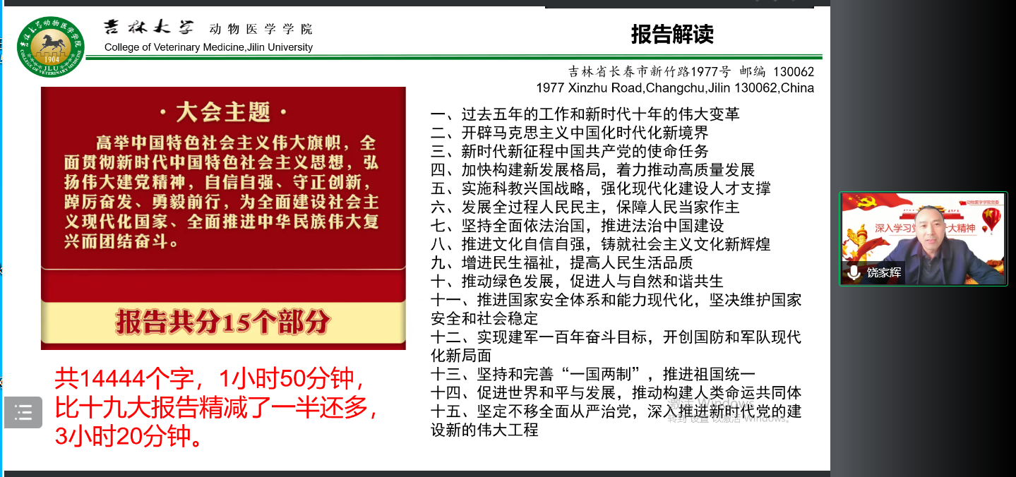 临床兽医学系教工党支部通过线上形式举行“学习贯彻落实党的二十大精神”专题会议,学院党委书记饶家辉为临床兽医学系全体教工讲专题党课,会议由临床兽医学系主任李心慰主持。
