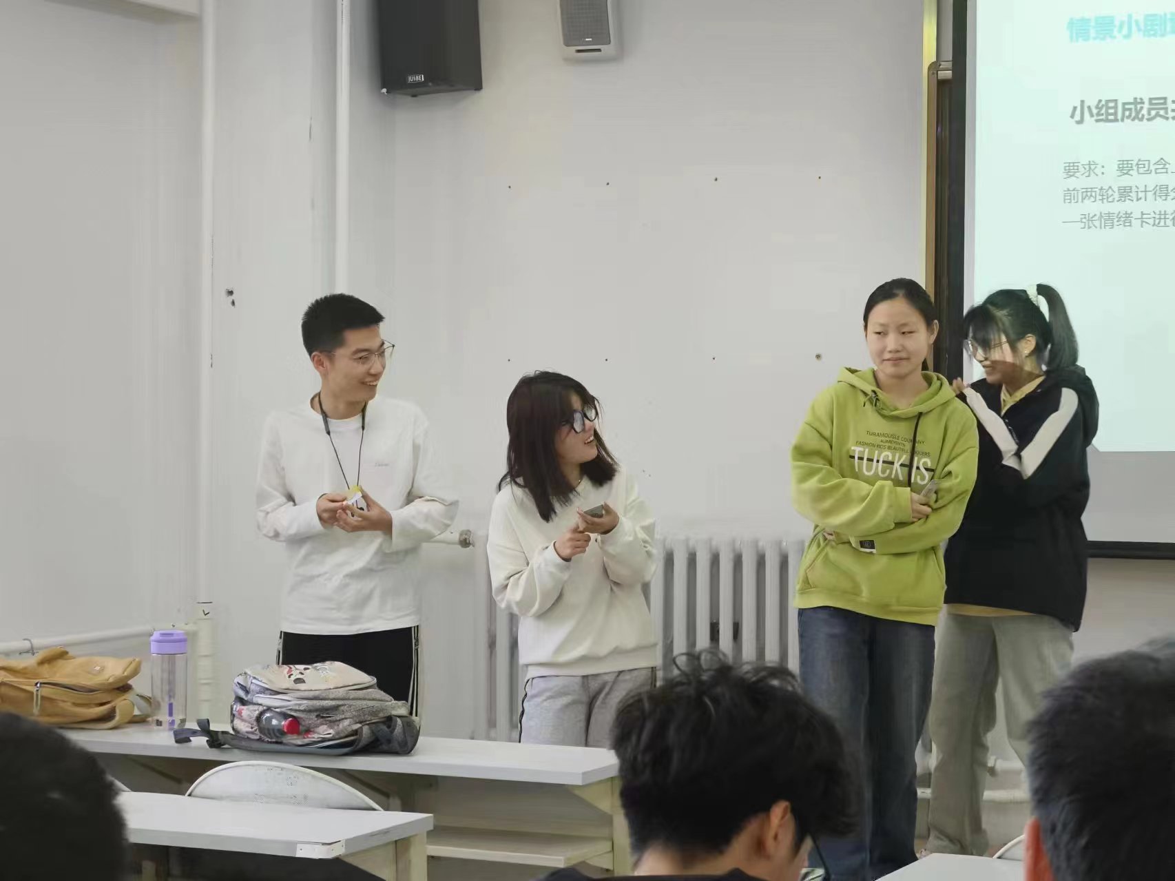 班会伊始,先进行了一个“终极密码”热身小游戏,由组织者写下一个数字,不断缩小数字范围,猜中密码的接受惩罚并决定下一轮数字,使同学们更好的融入到班会中来,提升参与感。第二项活动是“情绪大头贴”,每组两名成员抽取三到五张情绪卡,并表演出来卡片上的情绪,同学们都发挥想象,拓宽脑洞,欢乐不断。第三项活动是情景小剧场,根据上一项活动中抽到的情绪卡中的情绪创作情景剧并展示,大家通过自己的联想都创造出了幽默风趣的情景剧。快乐促进敞开心扉,大家在组内慢慢开始倾诉自己最近的小烦恼,一个又一个解决思路让倾诉者豁然开朗,也让同学们之间建立了独属于他们之间的信任纽带。