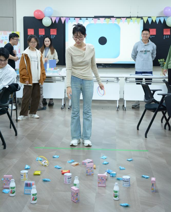 在进行完短暂的热身环节后,活动进入了过渡阶段。此阶段设置了五个趣味游戏,分别是“圈住快乐”、“愿望投壶”、“乒乓球传递”、“你画我猜”、“团体树”。参与者们被分成若干小组,分别参加了多项挑战。这些游戏不仅让大家享受到了竞争的乐趣,也促进了小组成员之间的沟通与合作。