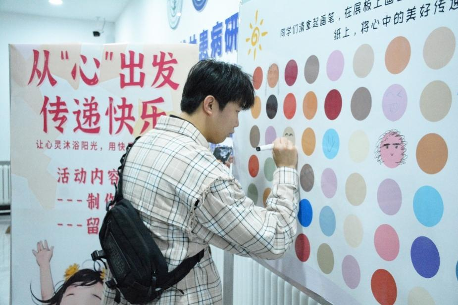 在“留下笑脸”环节,路过的同学们纷纷用颜料在展板上留下自己的笑脸或想画的脸庞,以及鼓励他人的话语。微笑墙的设立传递了正能量,让更多人感受到微笑的力量,积极面对生活。