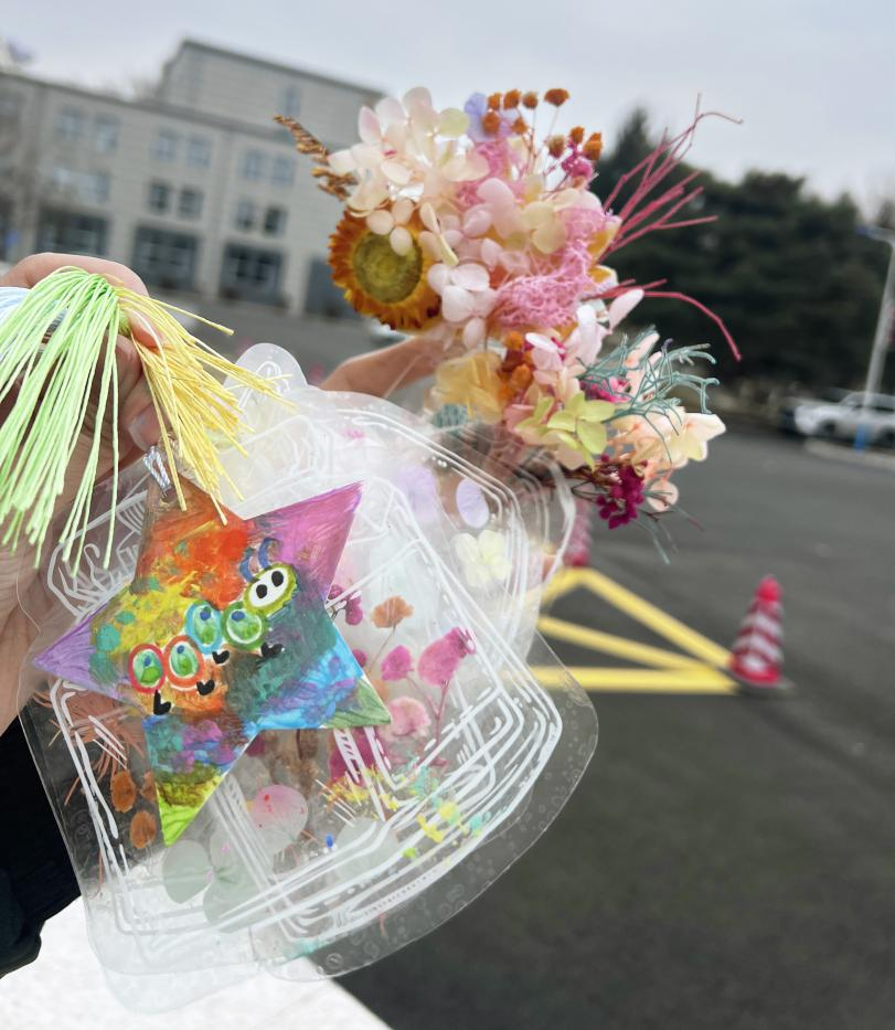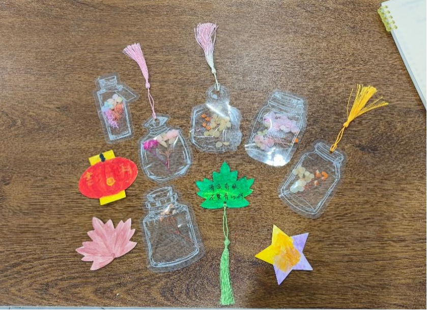 活动以“心花签语”环节拉开序幕。参与者利用树叶、鲜花等自然元素,结合透明贴、瓶子、纸片等材料,现场制作创意书签,并留下自己想说的话。这些书签不仅可供参与者带走,也为后来的同学提供了选择和留言的机会。在制作和选取书签的过程中,参与者得以亲近自然、放松心情、缓解压力。
